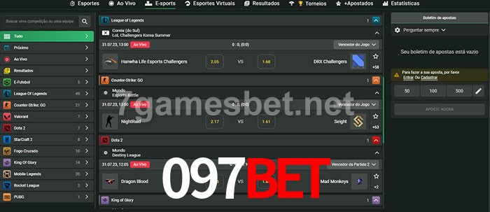 O 097Bet oferece uma grande seleção de opções de apostas em e-sports com probabilidades competitivas